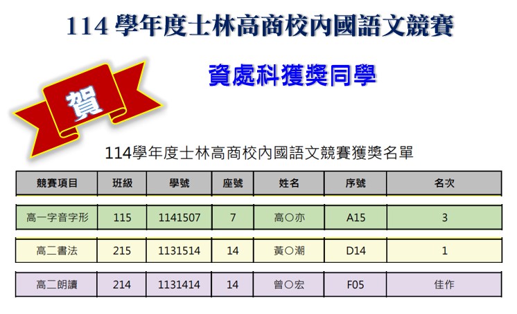 資處科同學參加114學年度校內國語文競賽成績優異!